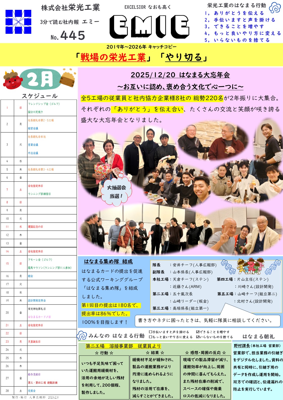2月号は、昨年年末の開催された「はなまる大忘年会」の写真を掲載。工場・事業部・役職・国籍などを超えた多くの交流が図られました。