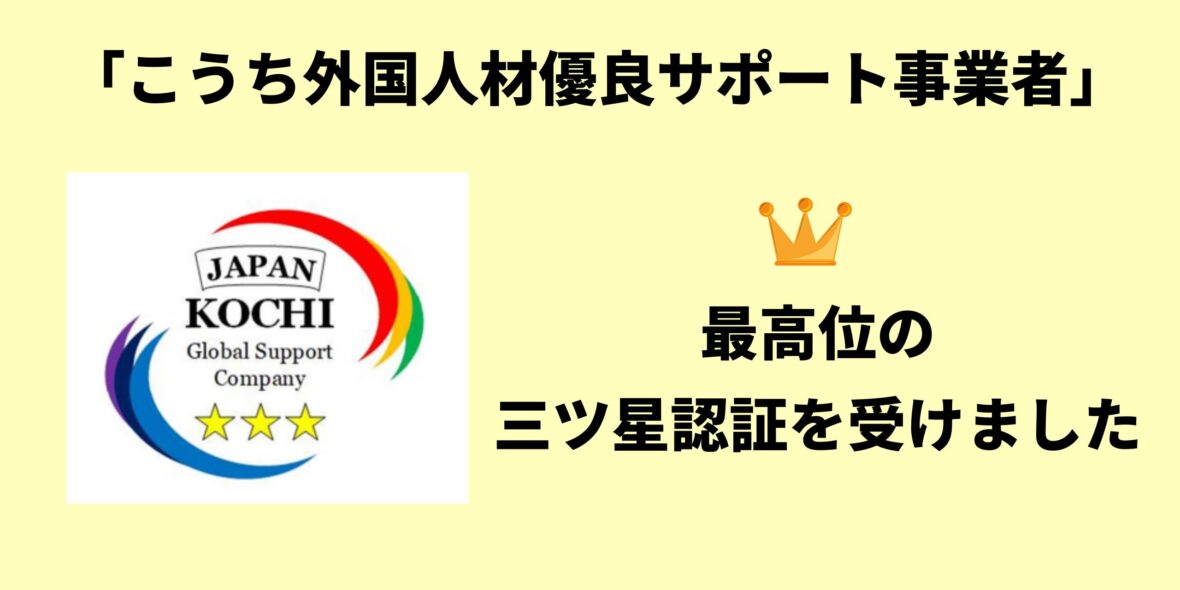【表彰】「こうち外国人材優良サポート事業者」として三ツ星認証を受けました!